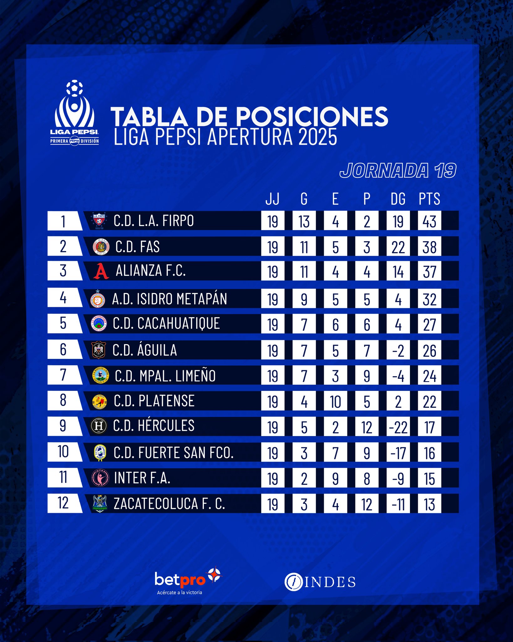 El Deportivo FAS le sigue de cerca y también ganó en esta jornada tras derrotar de visitante al Inter y así mantener la pelea en estas últimas jornadas para buscar ese primer lugar, pues se vienen fechas claves como la 20 donde Firpo tiene que ir a ganar al CD Hércules.